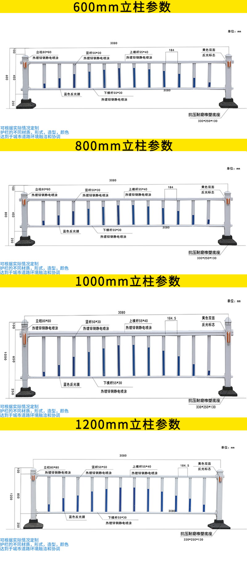 6.道路隔離欄桿還可以做成太陽能防眩光護欄,帶廣告牌道路隔離護欄,市政道路隔離護欄,人行道路護欄,機動與非機動隔離護欄、道