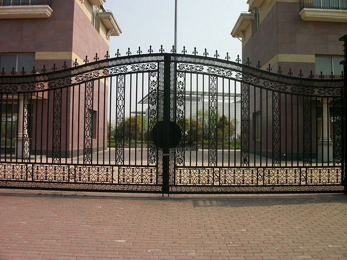 鐵藝從結(jié)構(gòu)上區(qū)分的話就分為兩種:1、欄桿通透型:主要做法為以尺寸較大的方管做大門的框架,然后使用鐵藝配件直接在框架中拼接鑲嵌。這種通透型的鐵藝大門的性能更加傾向于美觀,而且材料使用量比較少,適合做尺寸比較大的門,比如小區(qū)大門,別墅花園門等。2、實(shí)心門扇型